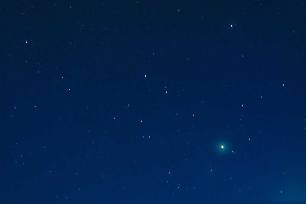 It must be “the southern shining one” as I faced toward the south, then I saw “one, two, three” in east, and one of them must be Suhayl. The constellation now looks like an imperfect diamond with the sharp edge on the horizon. As I take a closer look, I realized the sky was strangely clear, the uncommon came out. Three stars standing in a straight line.